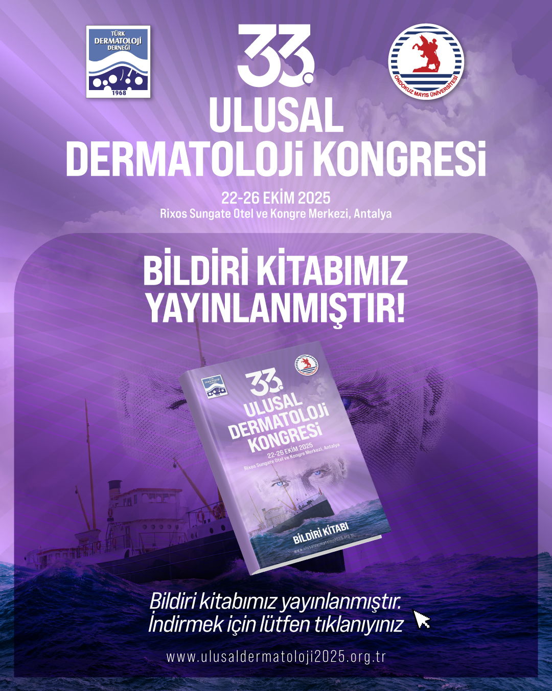 Türk Dermatoloji Derneği olarak, sizleri 22 - 26 Ekim 2025 tarihleri arasında Antalya’da Rixos Sungate Otel ve Kongre Merkezi, Ondokuz Mayıs Üniversitesi Tıp Fakültesi Deri ve Zührevi Hastalıklar Anabilim Dalı ev sahipliğinde gerçekleştireceğimiz ve bu sene 33’üncüsünü düzenleyeceğimiz Ulusal Kongremize davet etmekten büyük mutluluk duyuyoruz.